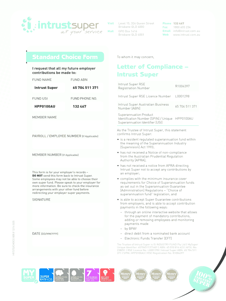 Visit Level 15, 324 Queen Street Brisbane QLD 4000 Mail GPO Box 1416 Brisbane QLD 4001 Phone 132 467 Fax 1800 603 234 Email info intrust.com.AU Web www.intrust.com.au Standard Choice Form To whom