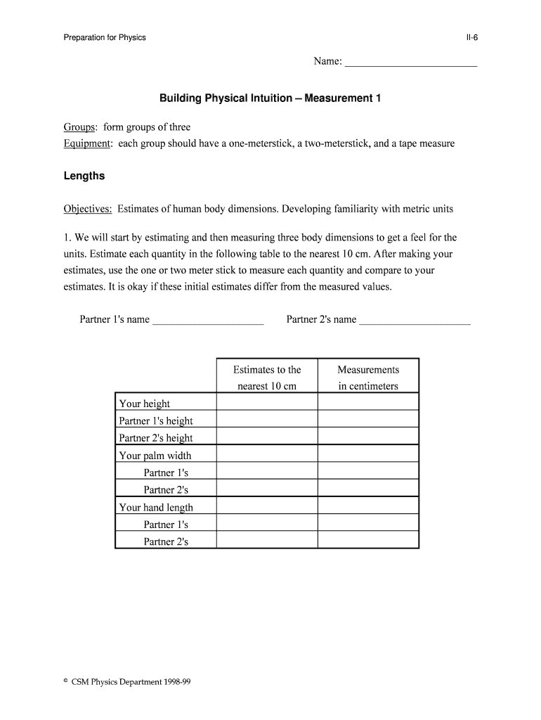 Preparation for Physics II-6 Name: Building Physical Intuition Measurement 1 Groups: form groups of three Equipment: each group should have a one-meterstick, a two-meterstick, and a tape measure Lengths