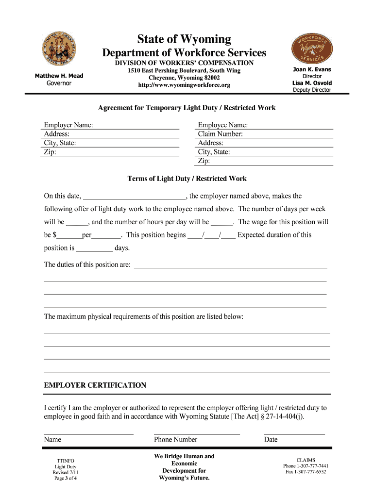 State of Wyoming Department of Workforce Services DIVISION OF WORKERS COMPENSATION Matthew H. Mead Governor 1510 East Pershing Boulevard, South Wing Cheyenne, Wyoming 82002 http://www.wyomingworkforce.org