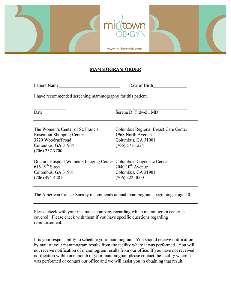 Get the free MAMMOGRAM ORDER - Midtown OB