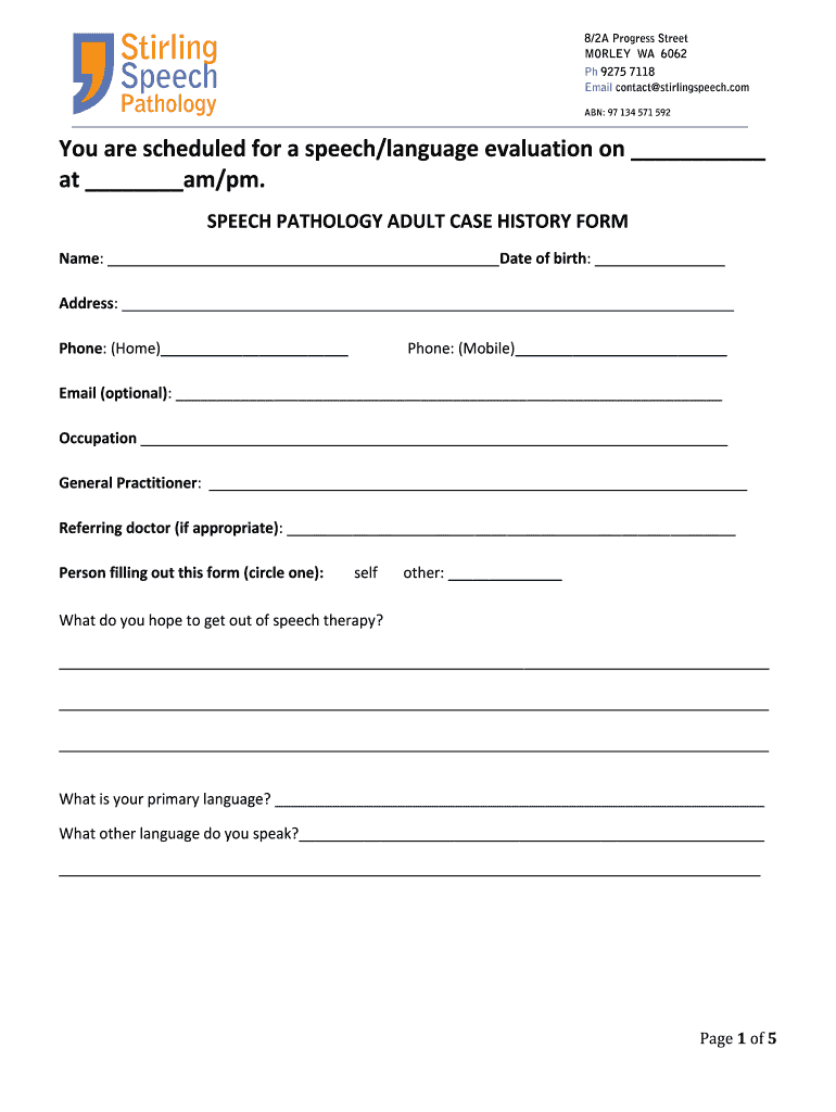 You are scheduled for a speech/language evaluation on at am/pm. SPEECH PATHOLOGY ADULT CASE HISTORY FORM Name: Date of birth: Address: Phone: (Home) Phone: (Mobile) Email (optional): Occupation General