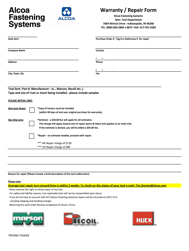 Warranty / Repair Form Alcoa Fastening Systems Attn: Tool Department 7669 Winston Drive — Indianapolis, IN 46268 TEL: (800) 826-2884 x 8874 FAX: 317-591-9285