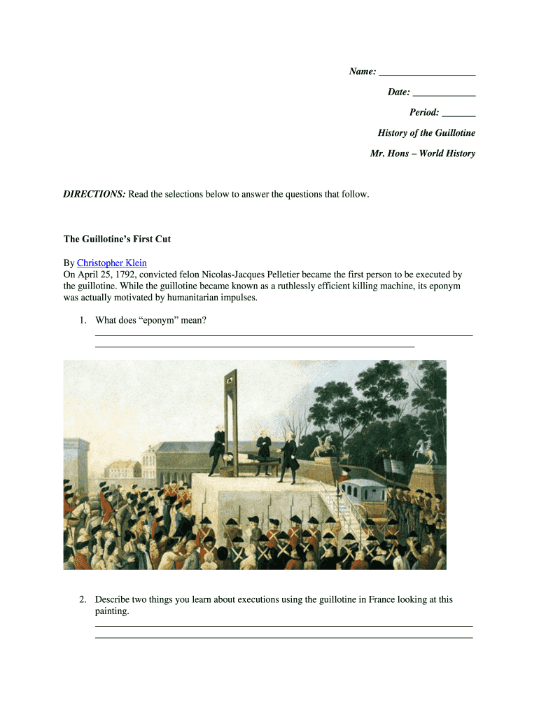 Name: Date: Period: History of the Guillotine Mr. Hons World History DIRECTIONS: Read the selections below to answer the questions that follow. The Guillotines First Cut By Christopher Klein On April