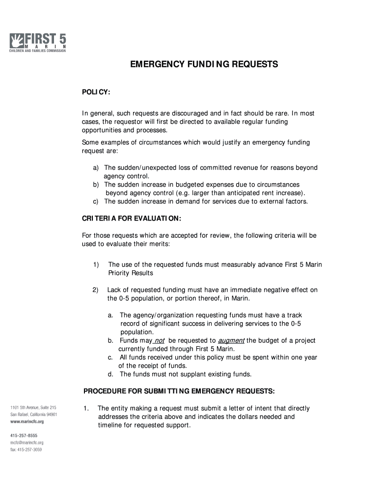 Get the free Emergency Funding Policy Application and Instructionsdoc cturesppt - first5marin