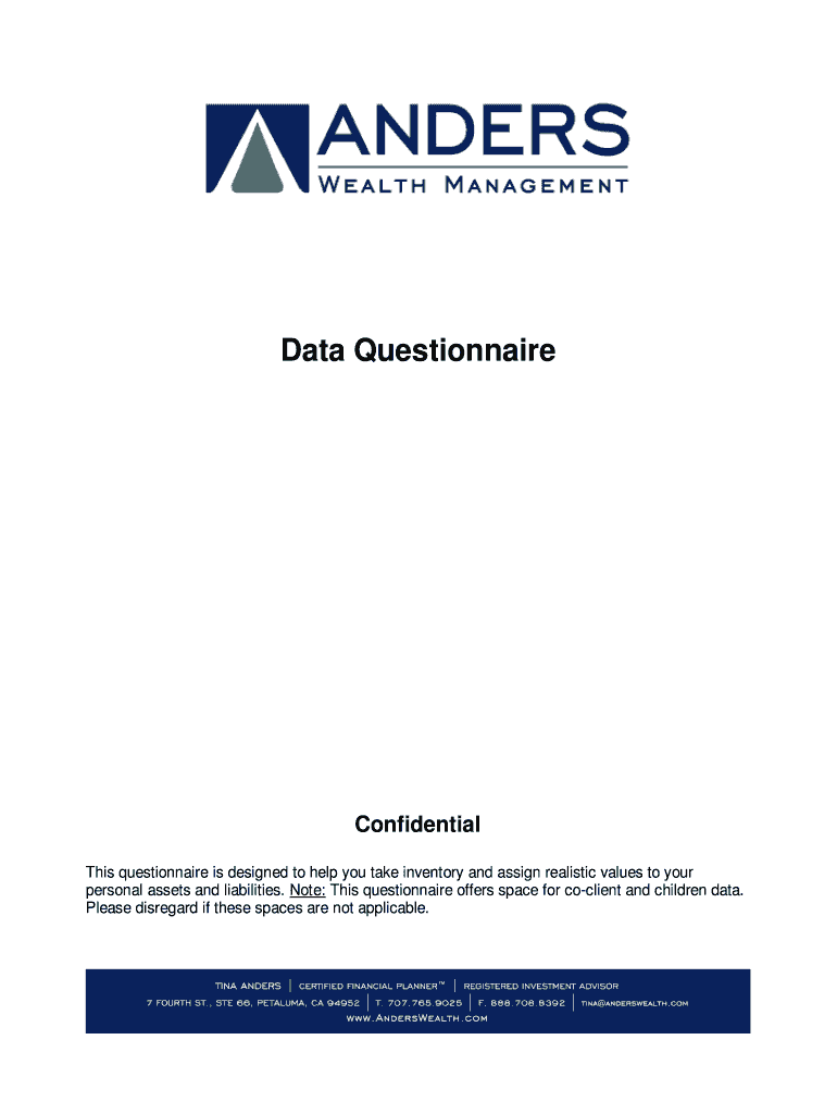 Data Questionnaire Confidential This questionnaire is designed to help you take inventory and assign realistic values to your personal assets and liabilities. Note: This questionnaire offers space