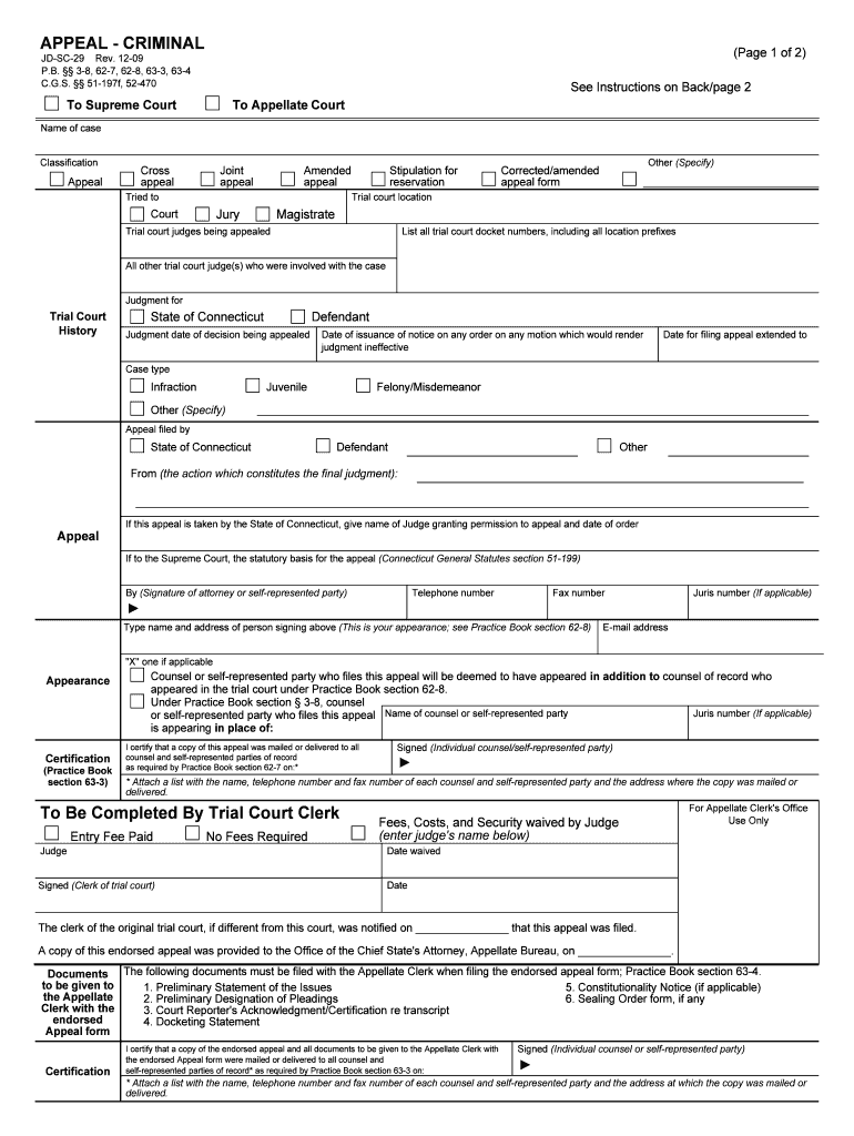 The Connecticut Criminal Appeal Form (JD-SC-29) is a legal document used by appellants in Connecticut to formally file an appeal in a criminal case.
