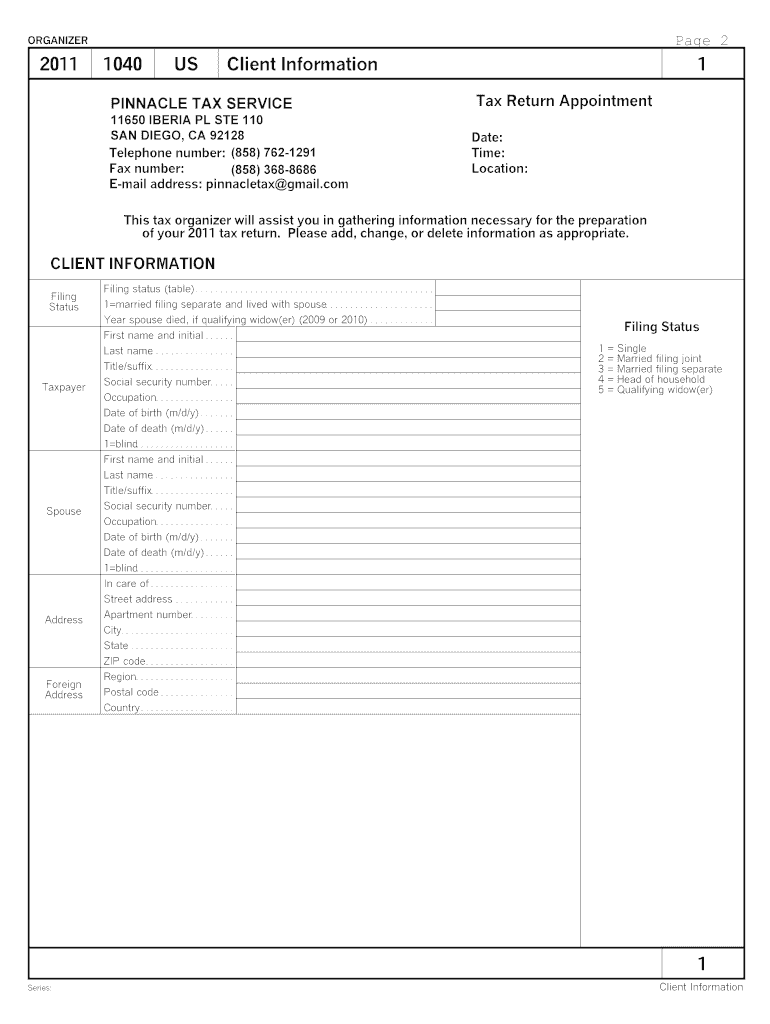The 2011 US Tax Return Organizer is designed for individual taxpayers, married couples, and tax professionals assisting clients with their 2011 tax return preparation.