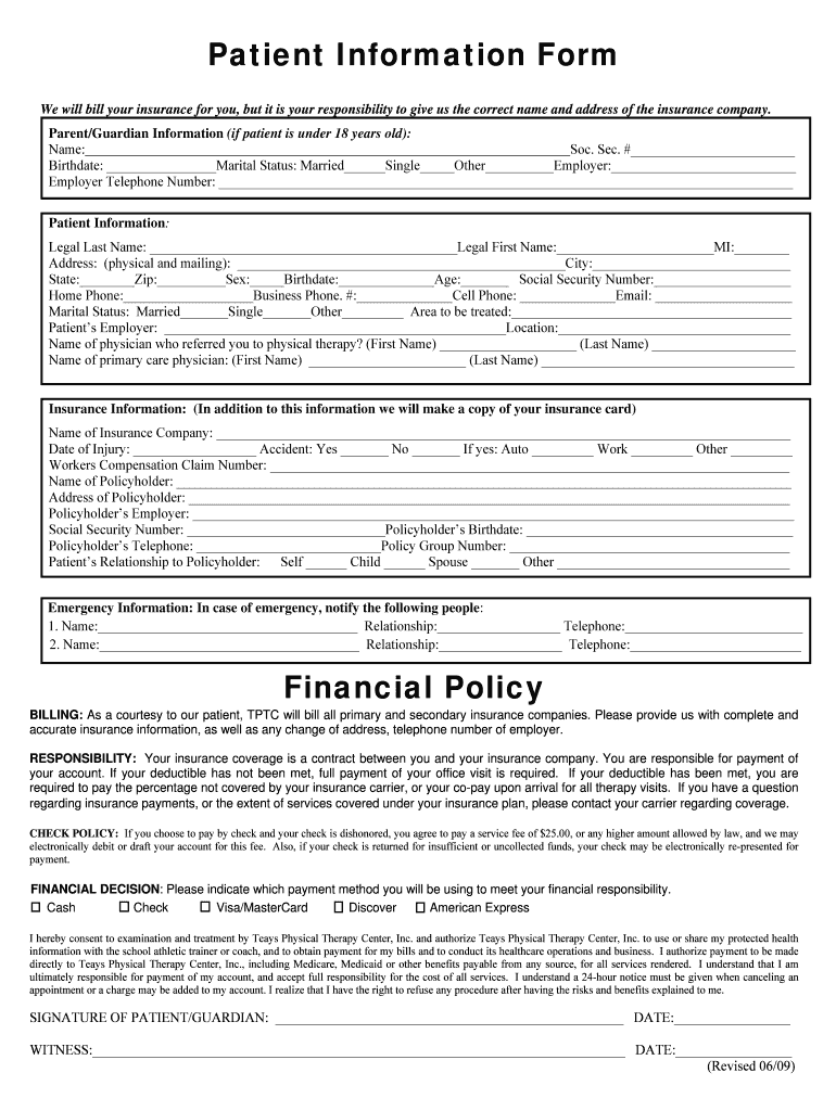 Get the free Patient Information Form - Teays Physical Therapy Center