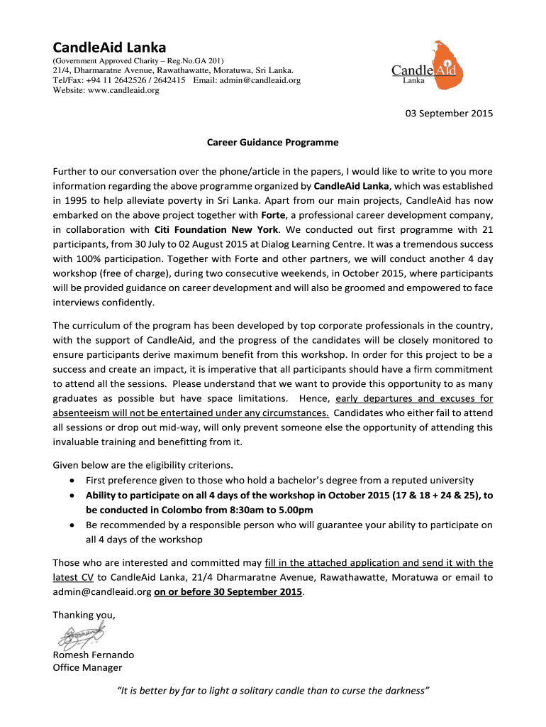 Candlelit Lanka (Government Approved Charity Reg.No.GA 201) 21/4, Dharmaratne Avenue, Rawathawatte, Maratha, Sri Lanka. Tel/Fax: +94 11 2642526 / 2642415 Email: admin candle aid.org Website: www.candleaid.org