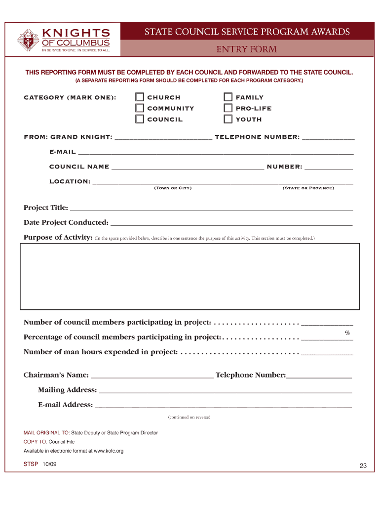 The State Council Service Program Awards Entry Form serves a crucial role in the competition, allowing councils to submit their community service projects for recognition. This form streamlines the submission process by collecting vital information about each project, including participant details and project objectives. Utilizing the state council service program awards form enables councils to thoroughly demonstrate their contributions to community service, while the knights of columbus awards form ensures that submissions are evaluated fairly and consistently.