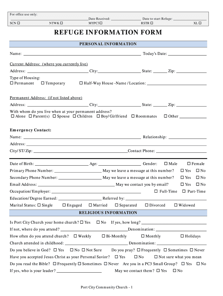 For office use only: SCN Date Received: MYPC3 NTW Date to start Refuge: RSR XL REFUGE INFORMATION FORM PERSONAL INFORMATION Name: Today's Date: Current Address: (where you currently live) Address: