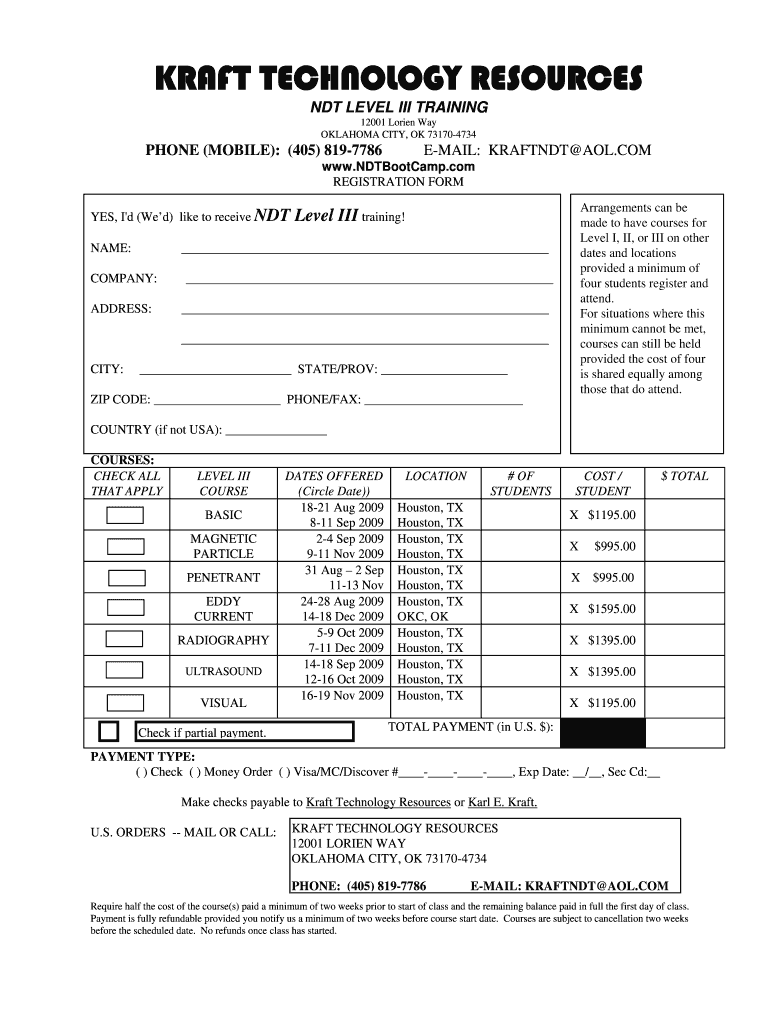 KRAFT TECHNOLOGY RESOURCES NDT LEVEL III TRAINING 12001 Lorain Way OKLAHOMA CITY, OK 731704734 PHONE (MOBILE): (405) 8197786 EMAIL: DRAFTED AOL.COM www.NDTBootCamp.com REGISTRATION FORM YES, I'd (Wed)