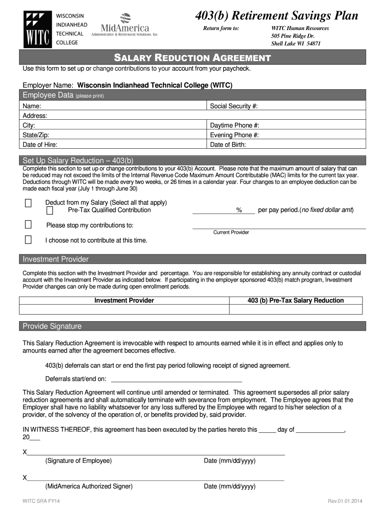 403(b) Retirement Savings Plan Return form to: WITH Human Resources 505 Pine Ridge Dr. Shell Lake WI 54871 SALARY REDUCTION AGREEMENT Use this form to set up or change contributions to your account