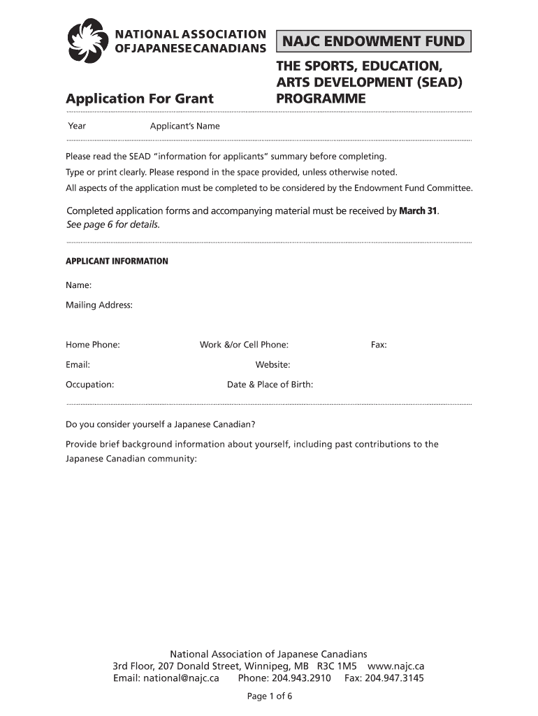 NATIONAL ASSOCIATION OF JAPANESE CANADIANS THE SPORTS, EDUCATION, ARTS DEVELOPMENT (HEAD) Program Application For Grant Year NAC Endowment Fund Applicant s Name Please read the HEAD information for