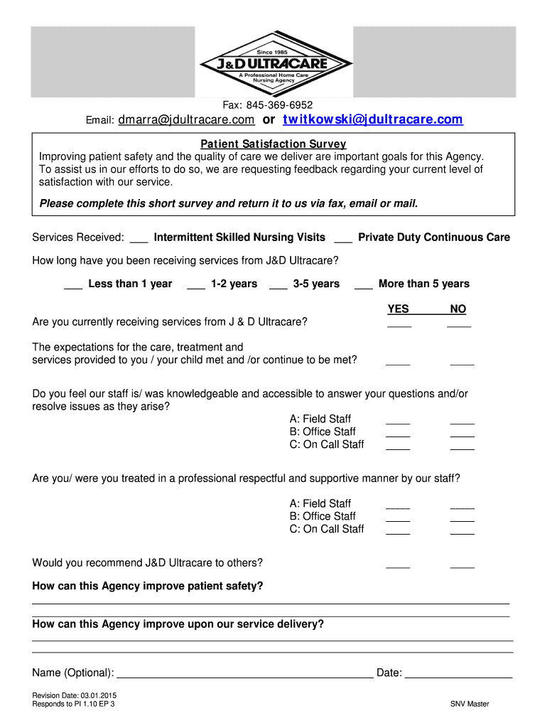 Revision Date: 03.01.2015 Responds to PI 1.10 EP 3 SNV Master Fax: 845-369-6952 Email: marry×jdultracare.com or Minkowski×jdultracare.com