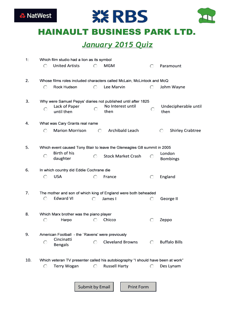 HAINAUT BUSINESS PARK LTD. January 2015 Quiz. 1: Which film studio had a lion as its symbol. United Artists. MGM Paramount 2. Whose films roles included characters ...