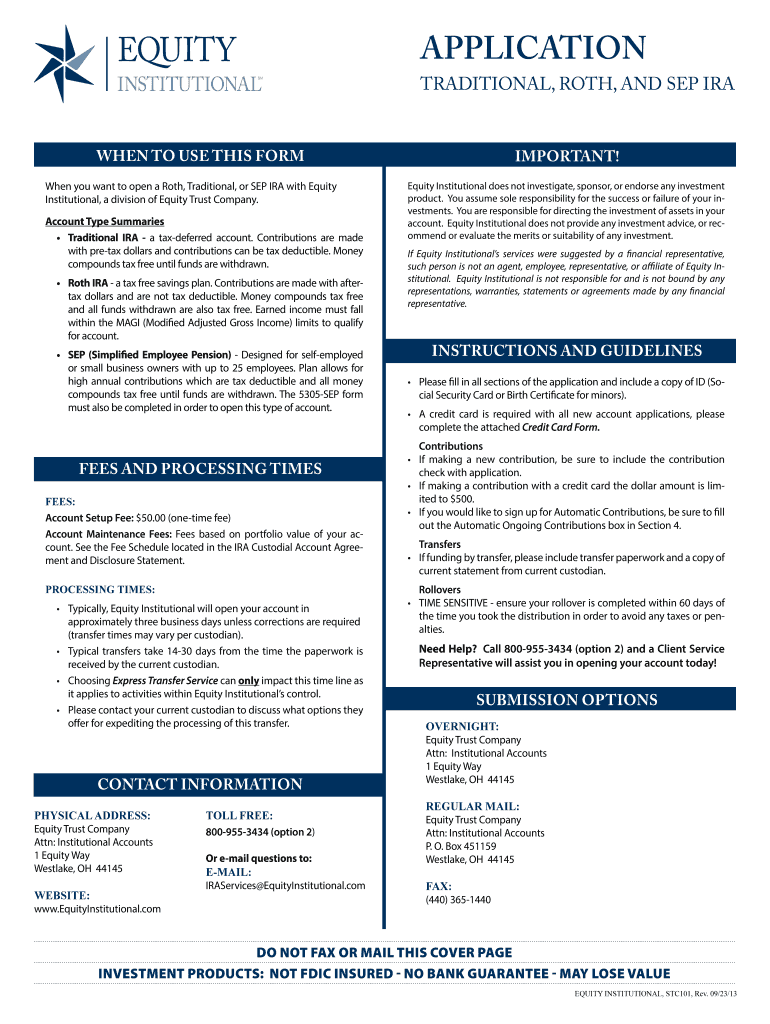 The Traditional, Roth, or SEP IRA Application is a personal finance document used by individuals to open an Individual Retirement Account (IRA) with Equity Institutional.