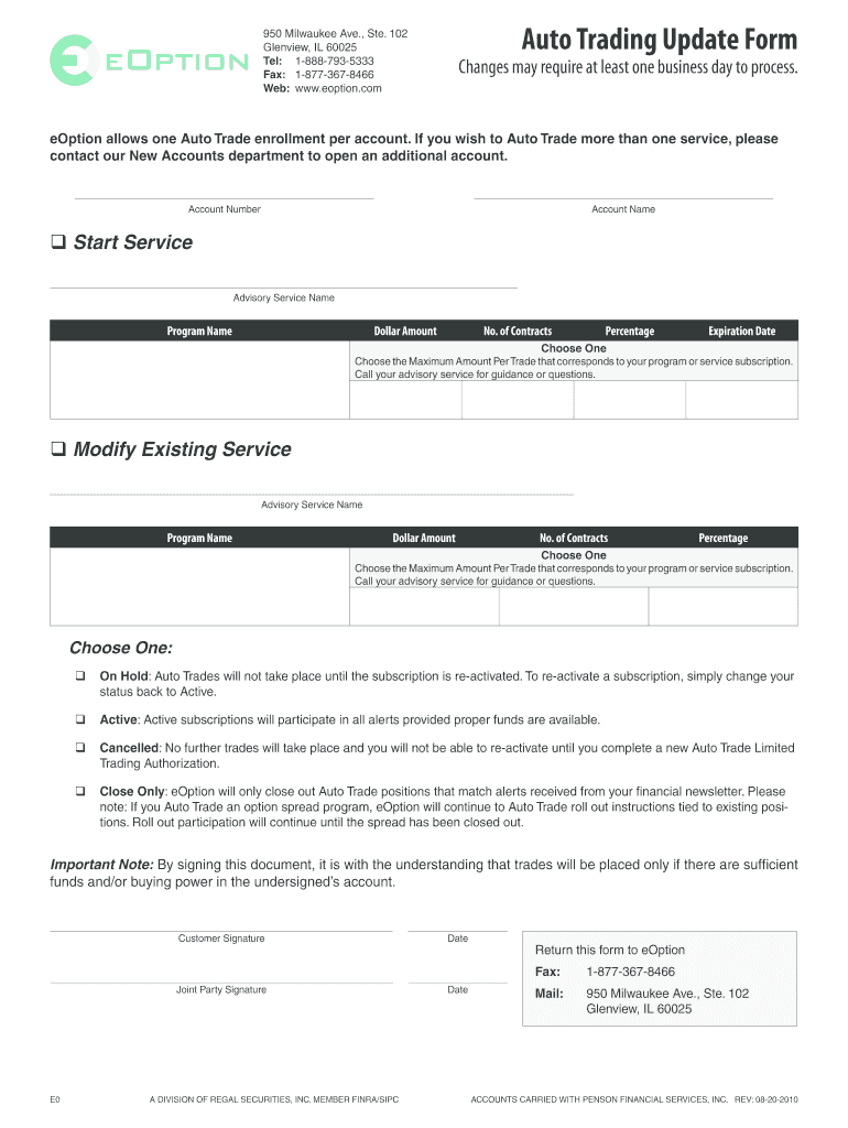 The Auto Trading Update Form is a crucial document for eOption customers, designed to facilitate the management of auto trading services. This form is essential for users looking to start, modify, or cancel their auto trading services with eOption. By utilizing the auto trade form, customers can effectively manage their trading preferences and streamline their investment processes.