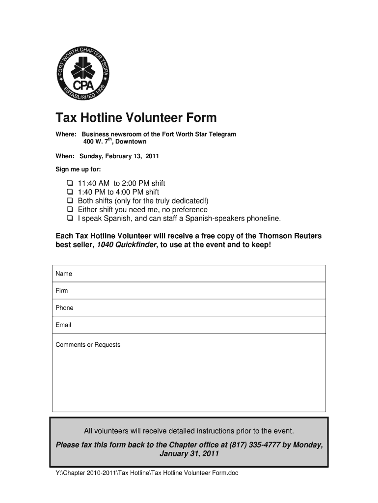 Tax Hotline Volunteer Form Where: Business newsroom of the Fort Worth Star Telegram TH 400 W. 7, Downtown When: Sunday, February 13, 2011, Sign me up for: ? ? ? ? ? 11:40 AM to 2:00 PM shift 1:40