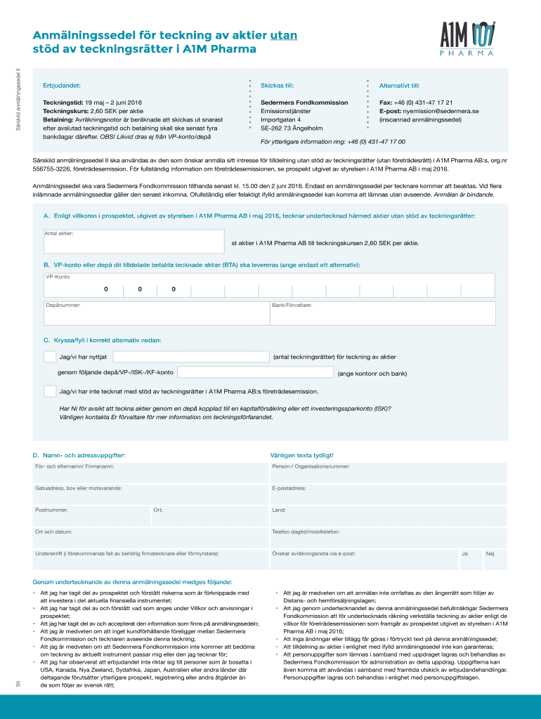 Get the free PHARMA Anm lningssedel f r teckning av aktier utan st d av teckningsr tter i A1M Pha...