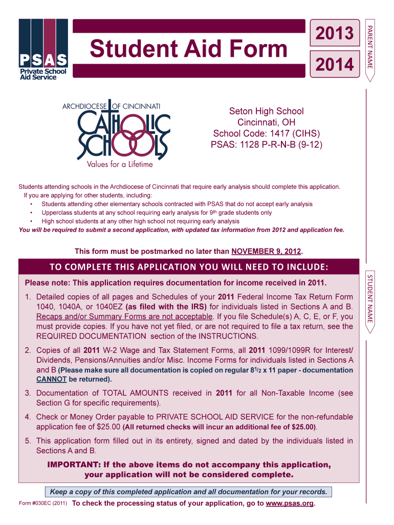 The 2013-2014 Student Aid Form must be postmarked by November 9, 2012. Timely submission is crucial to ensure consideration for financial assistance.