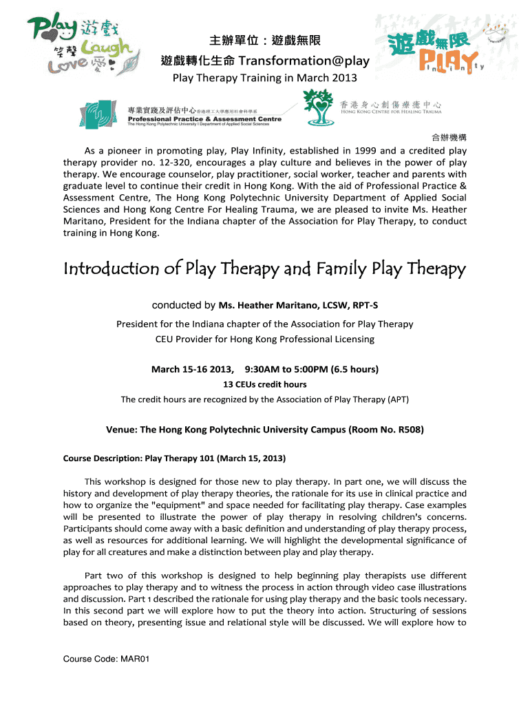 Transformation play Therapy Training in March 2013 As a pioneer in promoting play, Play Infinity, established in 1999 and a credited play therapy provider no. 12320, encourages a play culture and