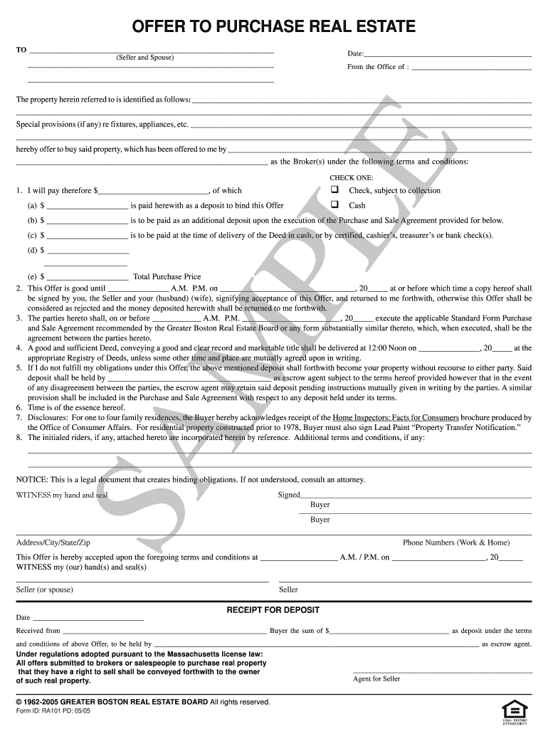 The Offer to Purchase Real Estate is a legal document used by buyers in Massachusetts to formally make an offer to purchase a property.