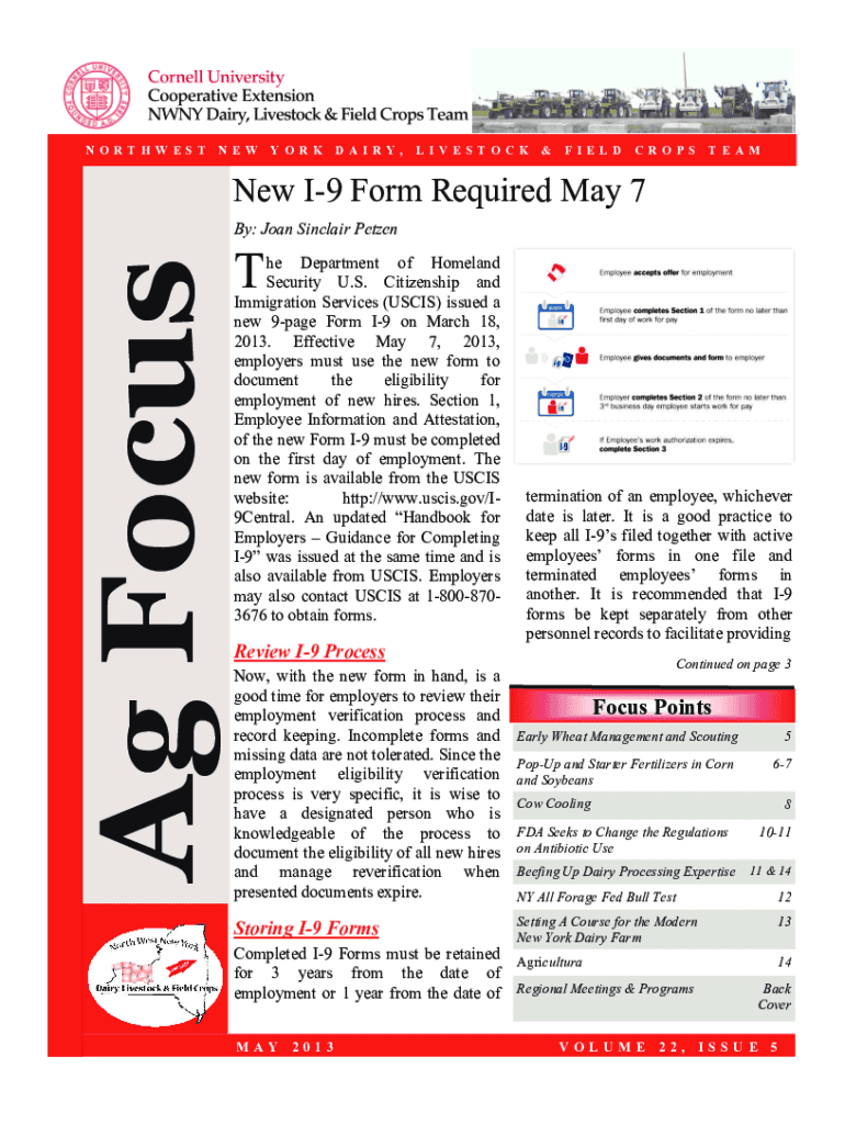 NORTHWESTNEWYORKDAIRY, LIVESTOCK&FIELDCROPSTEAMNew I9 Form Required May 7Ag Focus: Joan Sinclair Détente Department of Homeland Security U.S. Citizenship and Immigration Services (USCIS) issued a