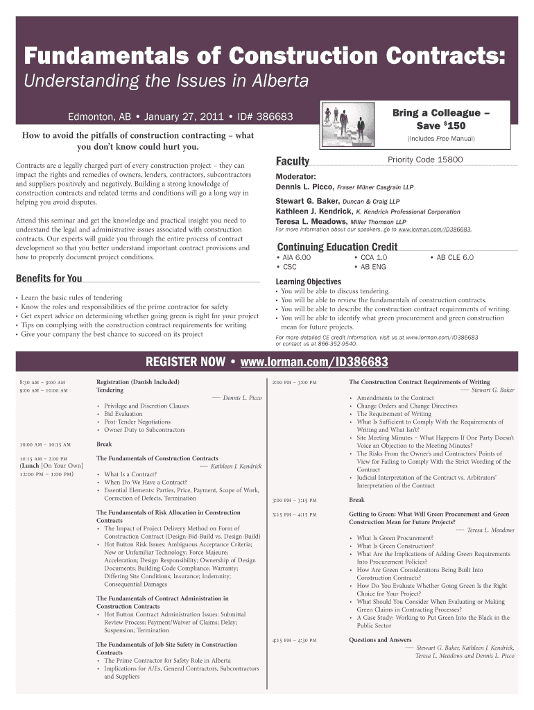 Fundamentals of Construction Contracts: Understanding the Issues in Alberta Bring a Colleague Save $150 Edmonton, AB January 27, 2011, ID# 386683 How to avoid the pitfalls of construction contracting