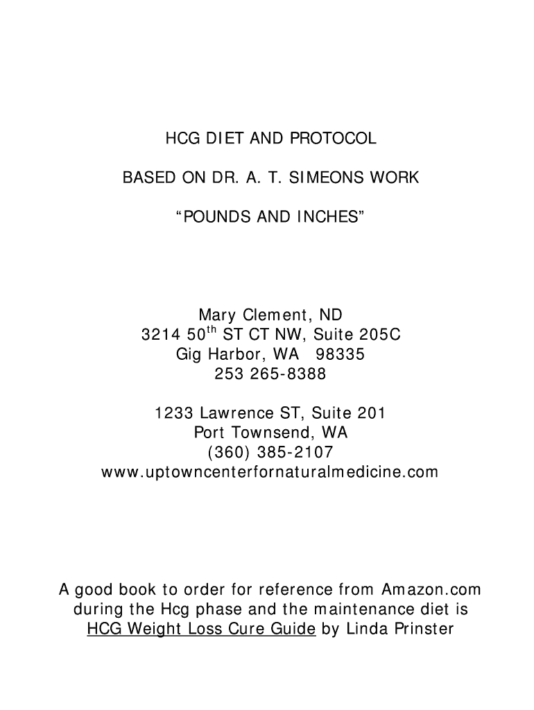 HCG DIET AND PROTOCOL BASED ON DR. A. T. SIMMONS WORK POUNDS AND INCHES Mary Clement, ND 3214 50th ST CT NW, Suite 205C Gig Harbor, WA 98335 253 2658388 1233 Lawrence ST, Suite 201 Port Townsend,