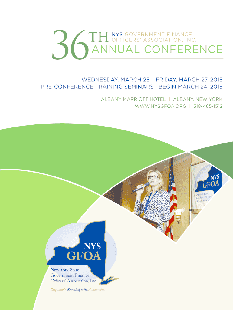 36th NYS GOVERNMENT FINANCE OFFICERS ASSOCIATION, INC. ANNUAL CONFERENCE WEDNESDAY, MARCH 25 FRIDAY, MARCH 27, 2015, CONFERENCE TRAINING SEMINARS BEGIN MARCH 24, 2015, ALBANY MARRIOTT HOTEL ALBANY,