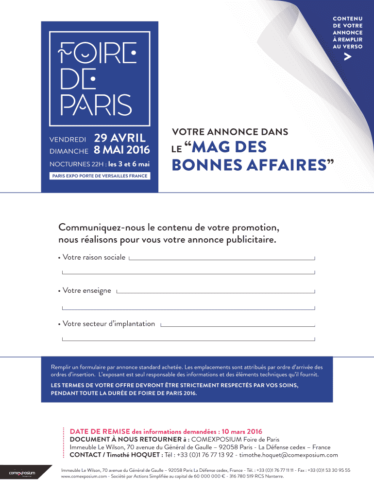 Get the free VOTRE ANNONCE DANS LE MAG DES BONNES AFFAIRES - services foiredeparis