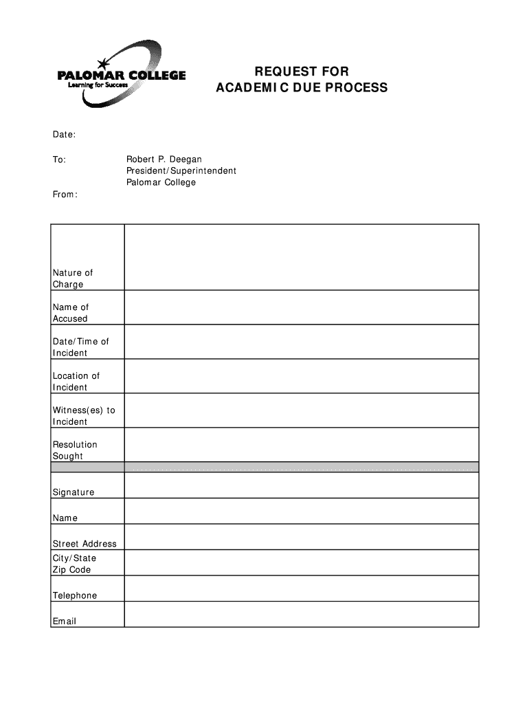 REQUEST FOR ACADEMIC DUE PROCESS Date: To: From: Nature of Charge Name of Accused Date/Time of Incident Location of Incident Witness(BS) to Incident Resolution Sought Signature Name Street Address
