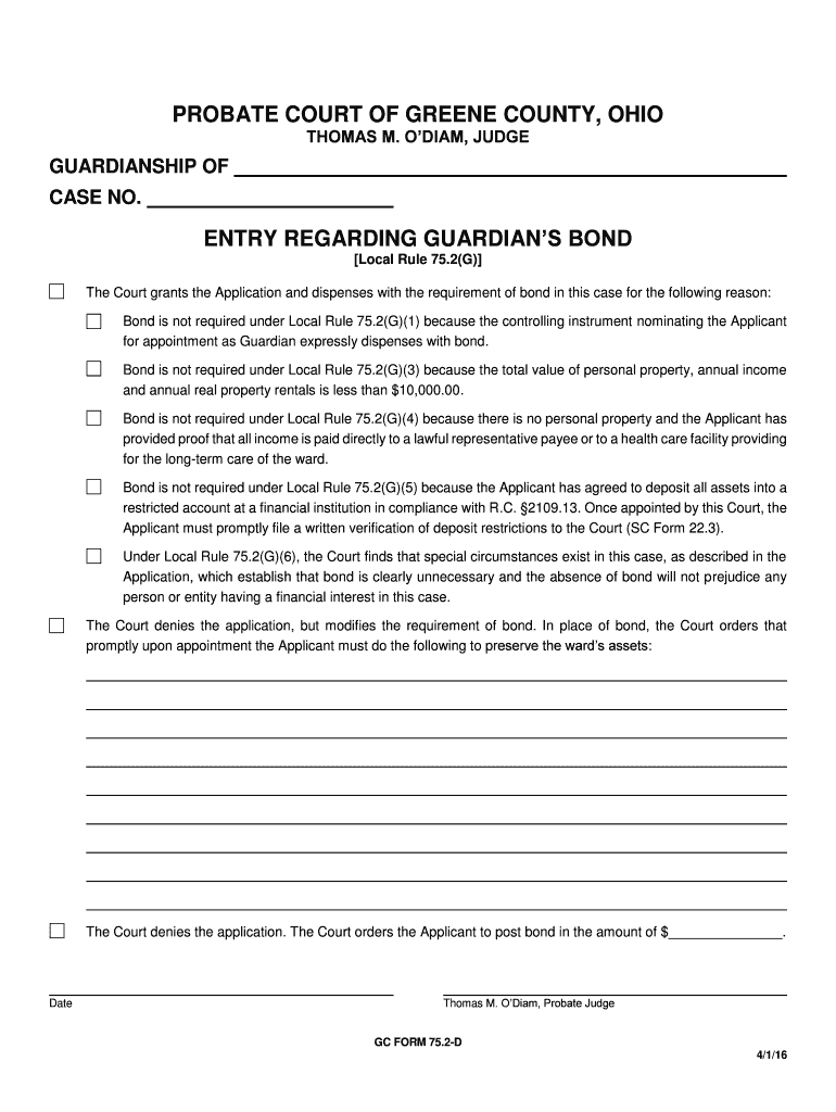 GC's form 75.2-d 4/1/16 probate court of Greene County, Ohio Thomas m. o diam, judge guardianship of case no. entry regarding guardian s bond