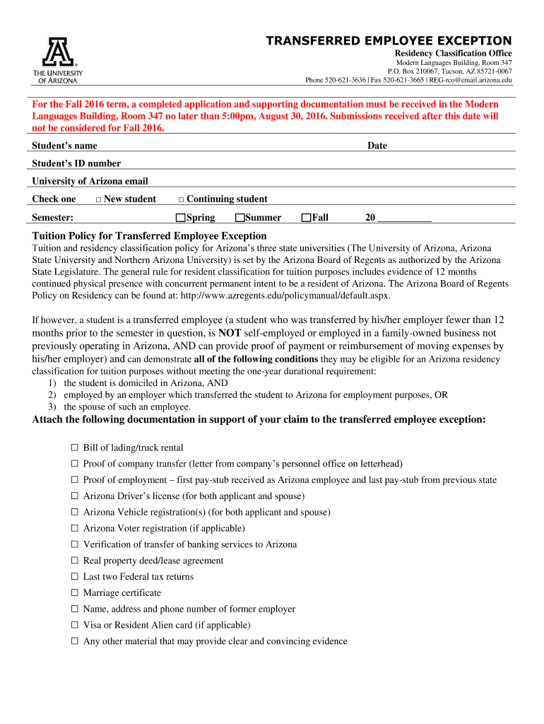 TRANSFERRED EMPLOYEE EXCEPTION Residency Classification Office Modern Languages Building, Room 347 P.O. Box 210067, Tucson, AZ 85721-0067 Phone 520-621-3636 Fax 520 ...