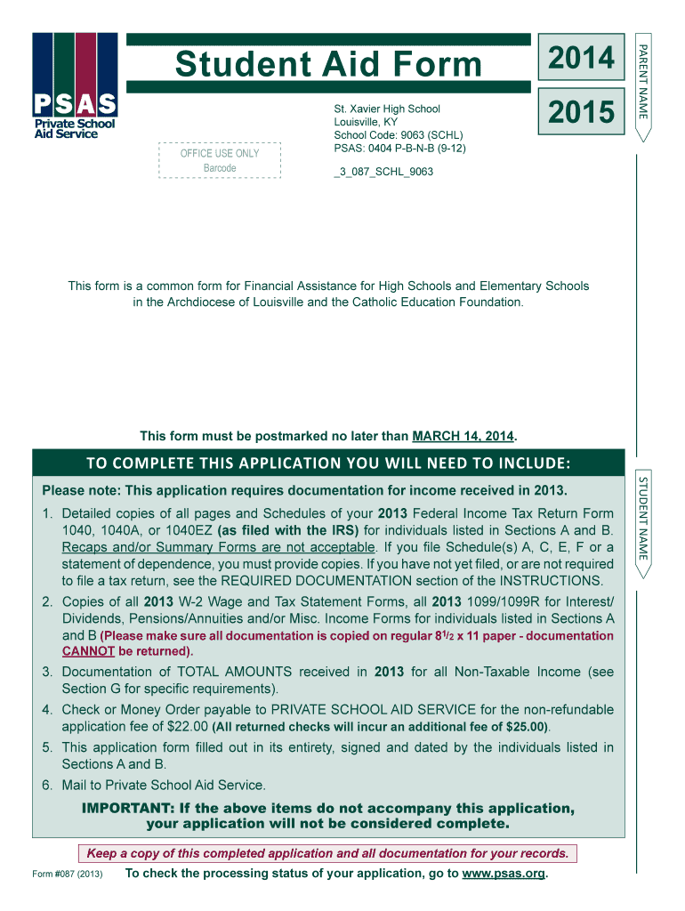 The completed Student Aid Form 2014 must be postmarked by March 14, 2014, to ensure consideration for financial aid for the academic year.