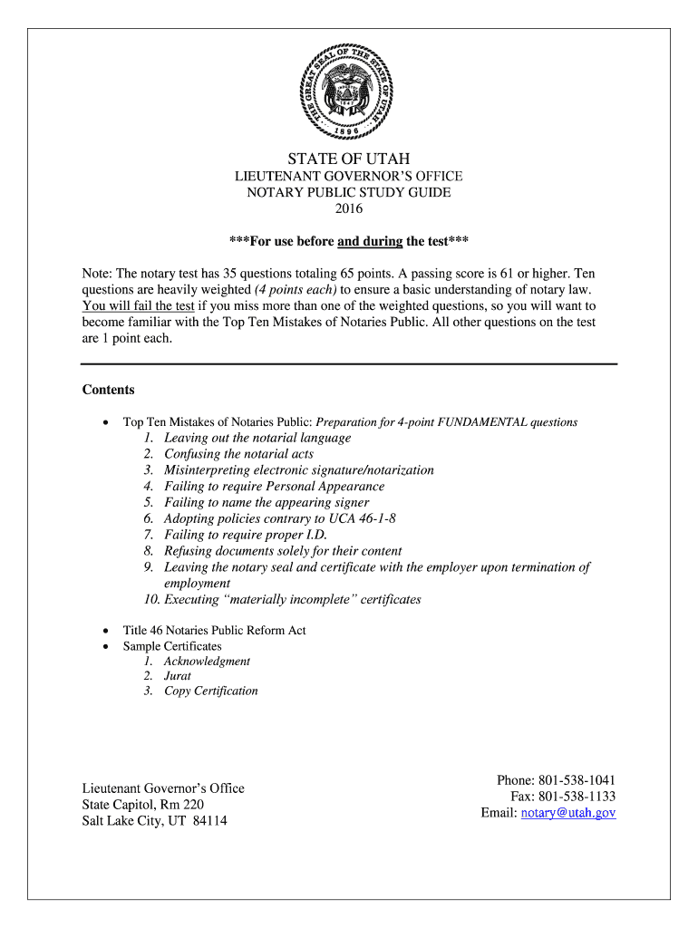 STATE OF UTAH LIEUTENANT GOVERNOR S OFFICE NOTARY PUBLIC STUDY GUIDE 2016 ***For use before and during the test*** Note: The notary test has 35 questions totaling 65 points. A passing score is 61