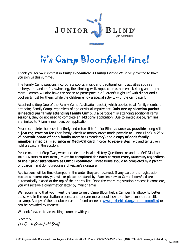 It's Camp Bloomfield time! Thank you for your interest in Camp Bloomfield's Family Camp! We're very excited to have you join us this summer. The Family Camp sessions incorporate sports, music and