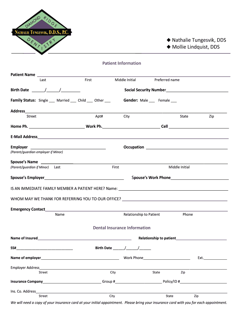 Nathalie Tungesvik, DDS Mollie Lundquist, DDS Patient Information Patient Name Last First Middle Initial Preferred name Birth Date / / Social Security Number Family Status: Single Married Child Other