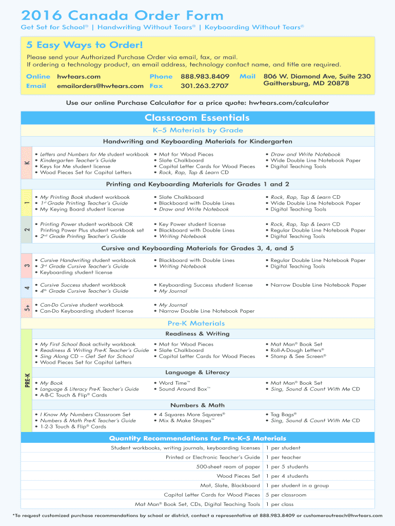 2016 Canada Order Form Get Set for School Handwriting Without Tears Keyboarding Without Tears 5 Easy Ways to Order! Please send your Authorized Purchase Order via email, fax, or mail. If ordering