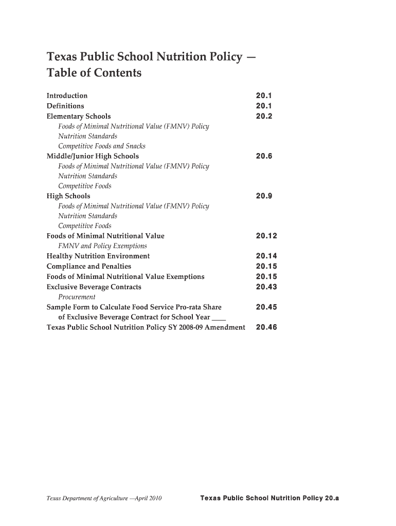 Texas Public School Nutrition Policy Table of Contents Introduction Definitions Elementary Schools Foods of Minimal Nutritional Value (FMV) Policy Nutrition Standards Competitive Foods and Snacks