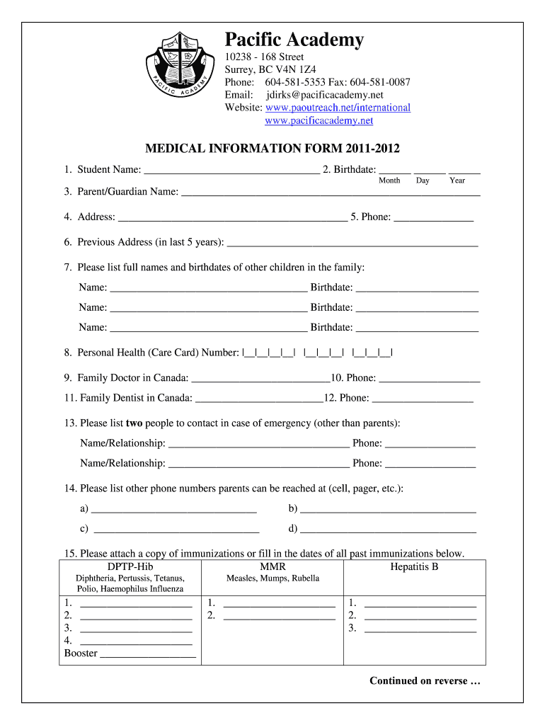 Pacific Academy 10238 168 Street Surrey, BC V4N 1Z4 Phone: 6045815353 Fax: 6045810087 Email: dirks pacific academy.net Website: www.paoutreach.net/international www.pacificacademy.net MEDICAL INFORMATION