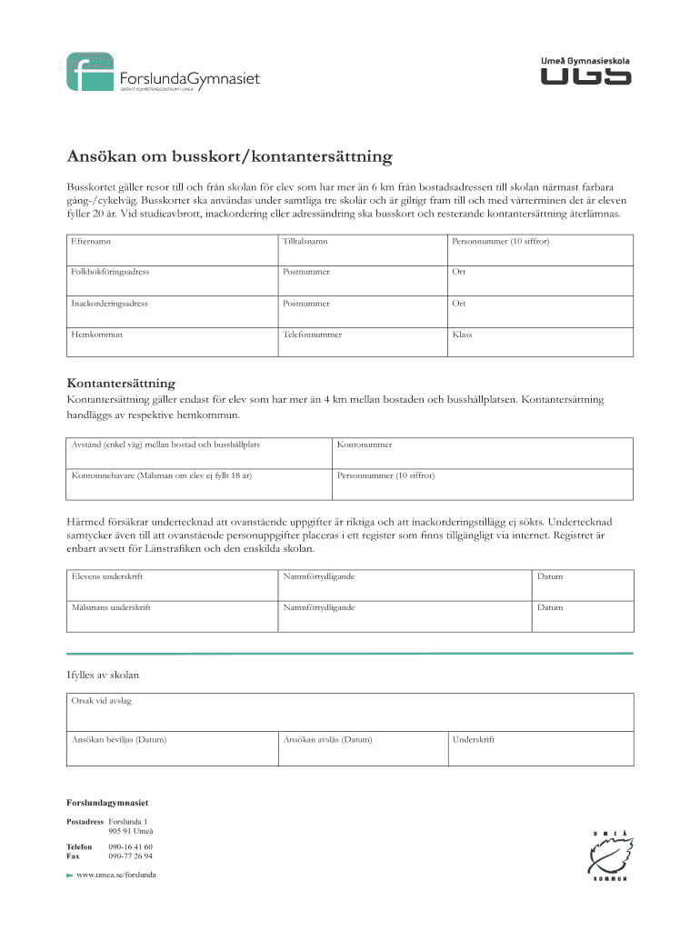 Get the free Ans kan om busskort/kontanters ttning Busskortet g ller resor till och fr n skolan f...