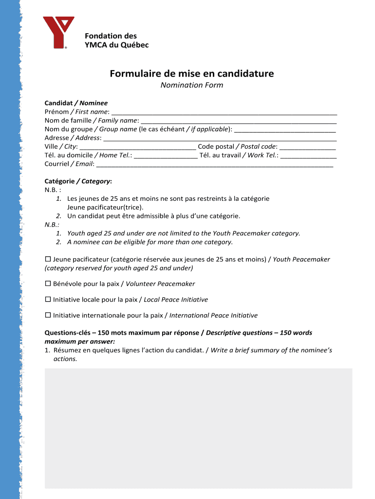 Foundation DES. YMCA Du EU BEC. Formula ire demise en candidature. Nomination Form. Candidate / Nominee. Pr not / First name: ...