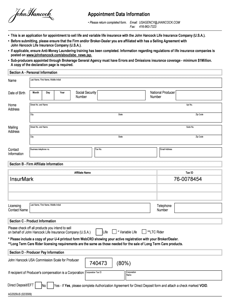 The form is intended for insurance agents applying to represent John Hancock Life Insurance Company. It requires both the agent and applicant to complete and sign necessary sections.