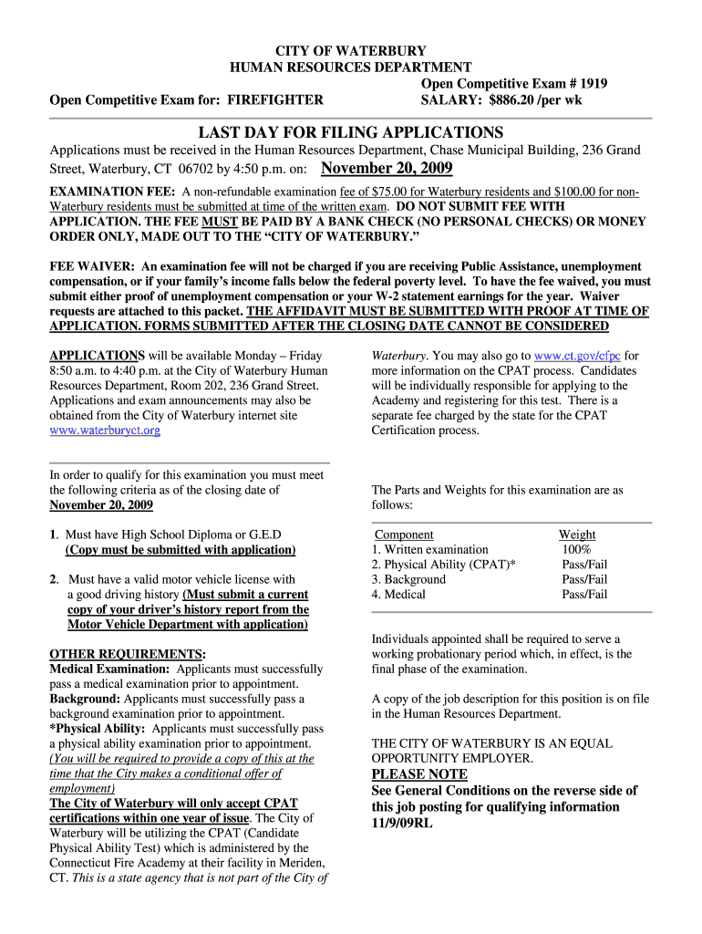 CITY OF WATERBURY HUMAN RESOURCES DEPARTMENT Open Competitive Exam # 1919 Open Competitive Exam for: FIREFIGHTER SALARY: $886.20 /per wk LAST DAY FOR FILING APPLICATIONS must be received in the Human