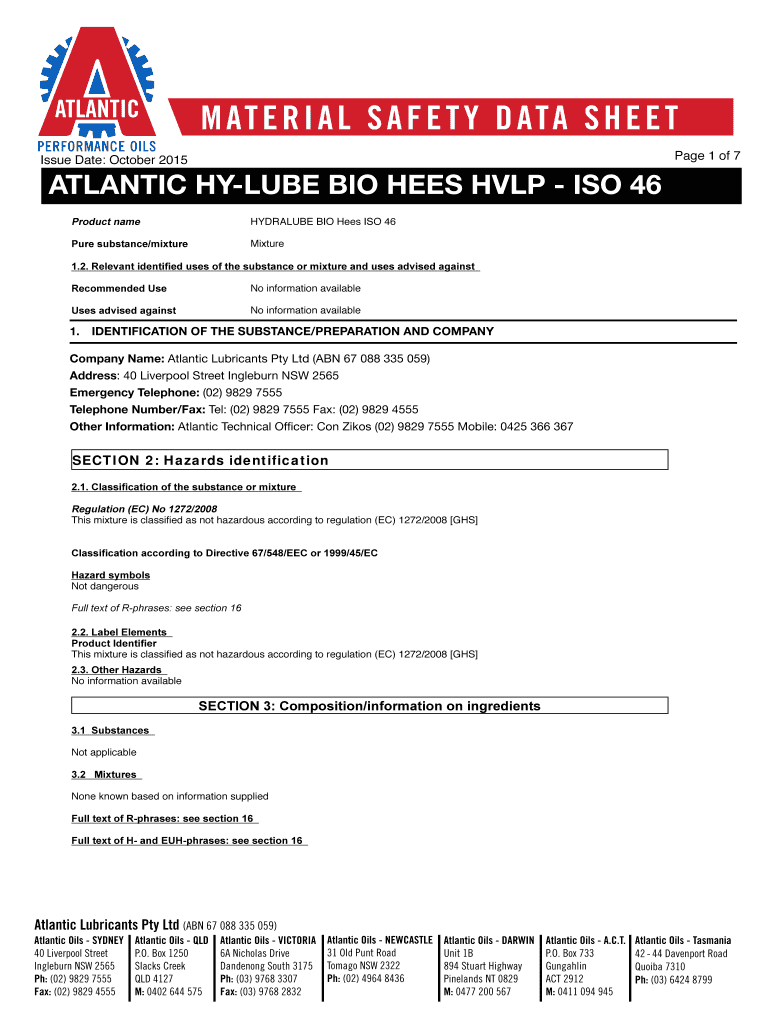 HYDRATE BIO Sees ISO 46 Issue date 17May2014 Revision date 17May2014 Safety Data Sheet SECTION 1: Identification of the substance/mixture and of the Version 1 company/undertaking HYDRATE BIO Sees