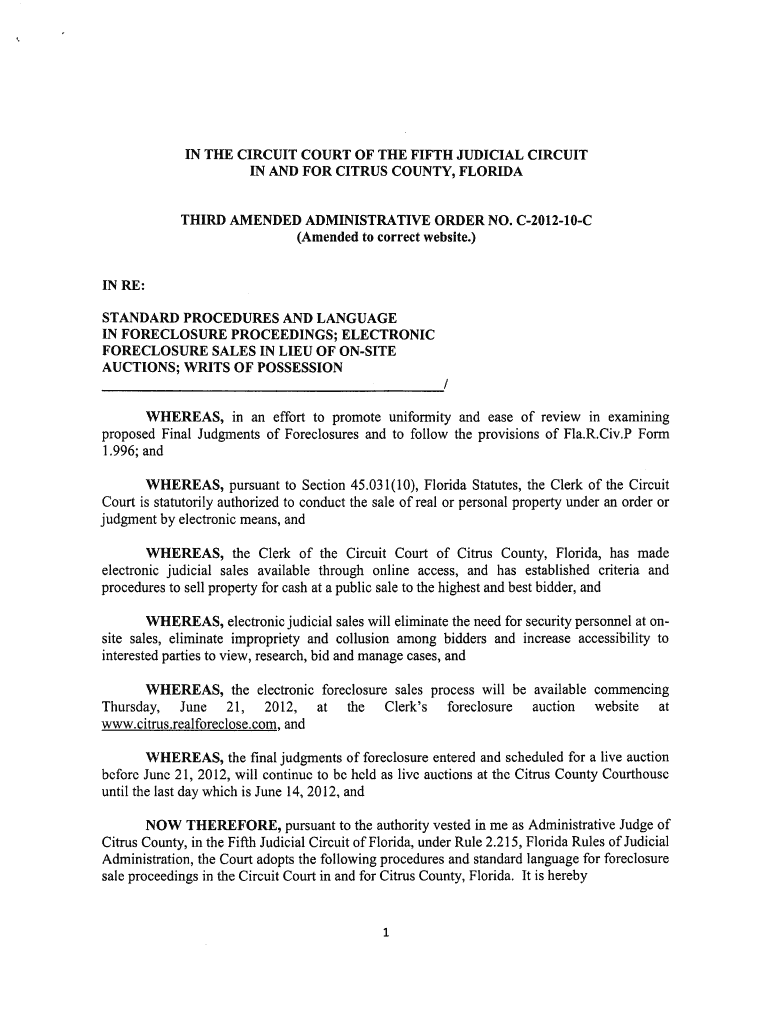IN THE CIRCUIT COURT OF THE FIFTH JUDICIAL CIRCUITING AND FOR CITRUS COUNTY, FLORIDATHIRD AMENDED ADMINISTRATIVE ORDER NO. C201210C(Amended to correct website.)IRE:STANDARD PROCEDURES AND LANGUAGE