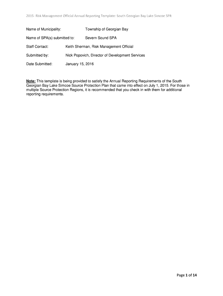 2015 Risk Management Official Annual Reporting Template: South Georgian Bay Lake Since SPR Name of Municipality: Township of Georgian Bay Name of SPA(s) submitted to: Severn Sound SPA Staff Contact:
