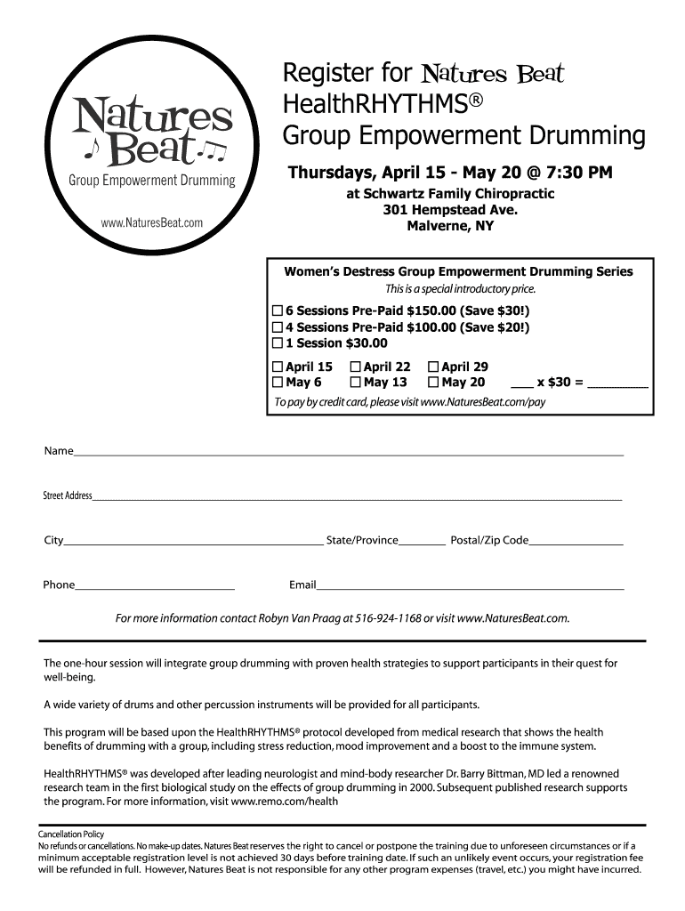 Register for Natures Beat HealthRHYTHMS Group Empowerment Drumming Thursdays, April 15 May 20 7:30 PM at Schwartz Family Chiropractic 301 Hempstead Ave. Laverne, NY Women's Distress Group Empowerment